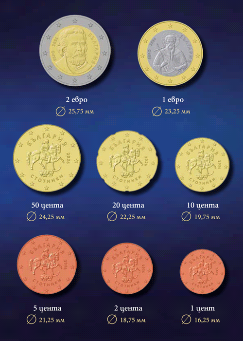 Едно евро ще носи образа на Иван Рилски, а останалите монети – на Мадарския конник. Монетите от 1, 2 и 5 евроцента – на български език – стотинки, ще бъдат с познатия ни жълт цвят. Останалите – 10, 20 и 50 евроцента, ще бъдат сребрист цвят. В подробното видео е описано теглото, гуртът, изображенията на общата страна и металната сплав, използвана за изработка.