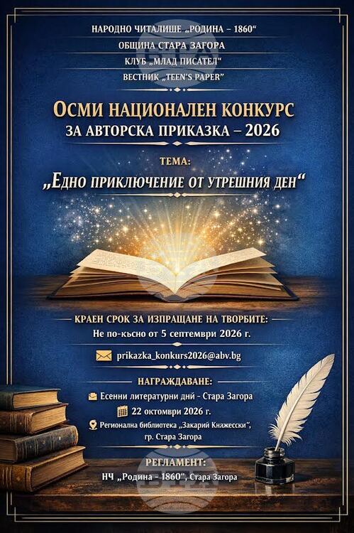 Осмото издание на Националния литературен конкурс за авторска приказка обявиха старозагорското Народно читалище „Родина“, Клуб „Млад писател“ и вестник Тeen’s paper. Това съобщиха на официалната си страница от Народно читалище „Родина“.