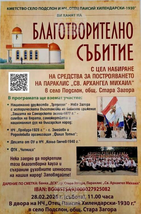 В старозагорското село Подслон организират благотворителен концерт за набиране на средства за построяване на параклис „Св. Архангел Михаил“