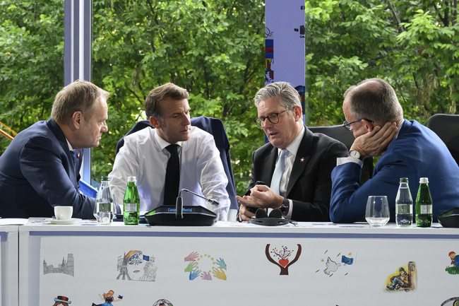 Полският премиер Доналд Туск, френският президент Еманюел Макрон, британският министър-председател Киър Стармър и германският канцлер Фридрих Мерц по време на среща за сигурността и Украйна,16 май 2025 г./Снимка: БТА