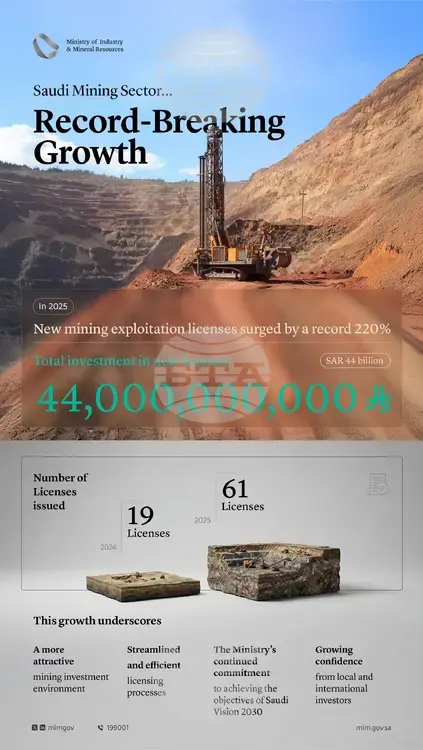 Министерството на индустрията и минералните ресурси обяви рекорден ръст в броя на новите разрешения за добив на полезни изкопаеми, издадени през 2025 г., като отчита значително увеличение от 220% в сравнение с 2024 г., съобщи саудитската новинарска агенция СПА.