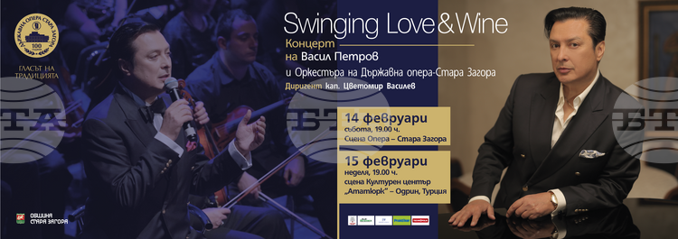 Според афиша, „Swinging Love & Wine“ е съвместен проект на известния певец Васил Петров, наричан “българския Синатра”, с оркестъра на Държавна опера – Стара Загора под диригентството на Цветомир Василев и концертмайстор Паулина Захариева.