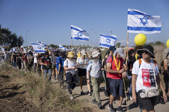 Роднини и приятели на заложниците, държани от „Хамас“, участват в шествие под надслов „Поход за заложниците“ от Тел Авив до кабинета на премиера Бенямин Нетаняху в Йерусалим, 16 ноември 2023 г. Снимка: АП/БТА