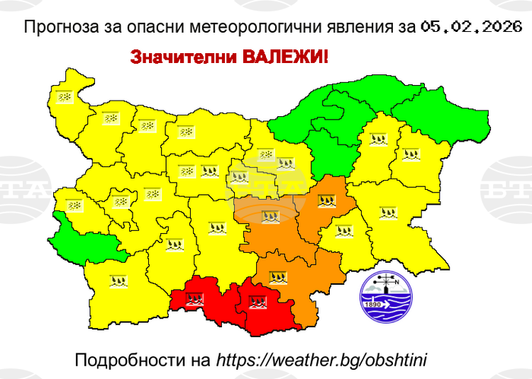 Червен код за значителни валежи обяви Националният институт по метеорология и хидрология за четвъртък 5 февруари за част от областите Кърджали и Смолян. В област Кърджали червеният код е в сила за Кирково и Крумовград, а в област Смолян за Златоград и Рудозем. В останалите населени места на двете области е в сила оранжев код.